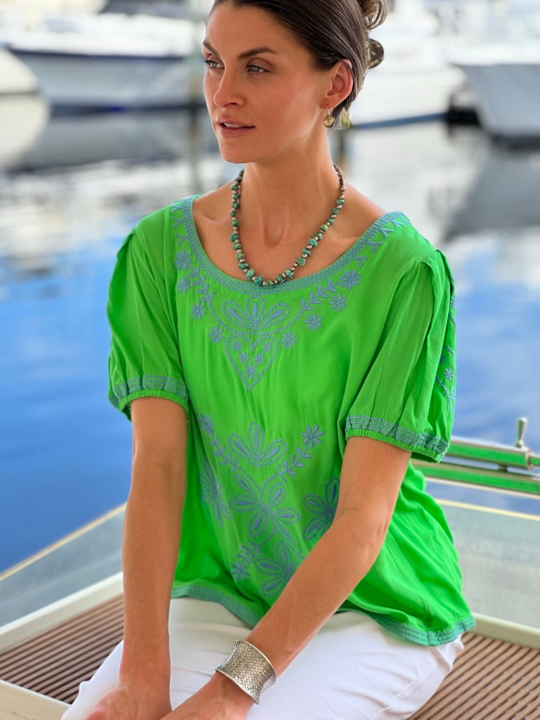 A legacy of artistry, reawakened. These artisan-made designs mark Sigrid Olsen’s return to fashion — viewed through the lens of a life shaped by nature’s rhythm: slower, more intentional, and deeply human. Crafted in cotton and hand-printed in joyful hues, each piece embodies her love of colorful, sustainable clothing, created with care and meaning stitched into every seam.