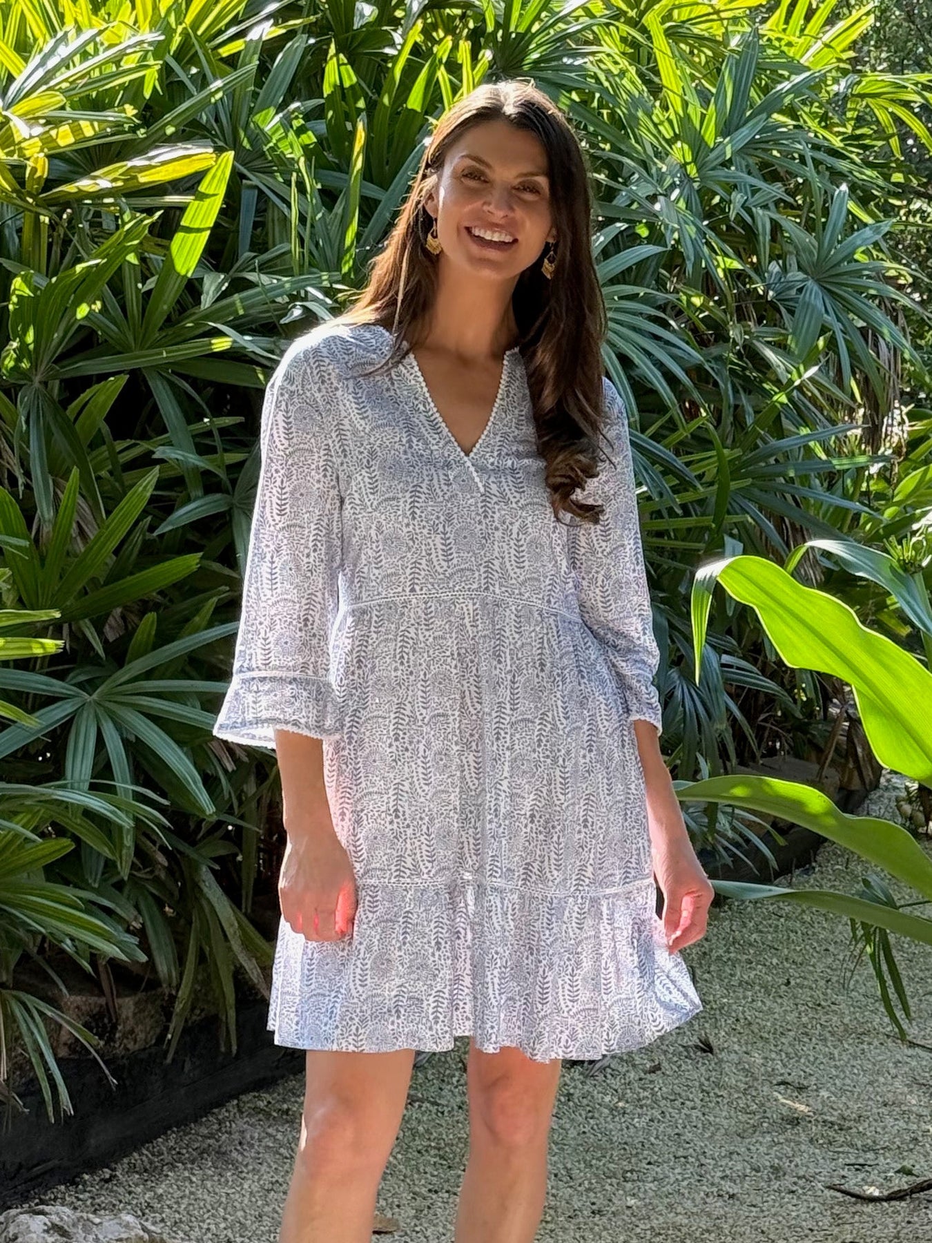 The Moorea Dress in Sigrid's original Primavera Print is designed to make you feel effortlessly beautiful. Its flattering silhouette features multiple graceful tiers that flow naturally with every movement, creating an elegant drape that works for countless occasions. The knee-length cut strikes the perfect balance between polished and comfortable. Thoughtful details elevate this dress beyond the everyday. Delicate lace accents nestle between each tier and frame the neckline, adding texture and refinement. The three-quarter sleeves are finished with a gentle flounce at the cuff—a charming touch that brings movement and personality to the design. The Primavera print is where this dress truly shines. Inspired by Sigrid's original hand-painted artwork, the design captures the essence of spring with delicate, artistic flair. Each dress is meticulously block printed by skilled artisans in India, meaning you're wearing a one-of-a-kind piece that celebrates traditional craftsmanship and supports artisan communities. Whether you're dressing for a special event, a day out, or simply want to feel supported and confident in what you wear, the Moorea Dress in Primavera delivers timeless style with a story behind every stitch.