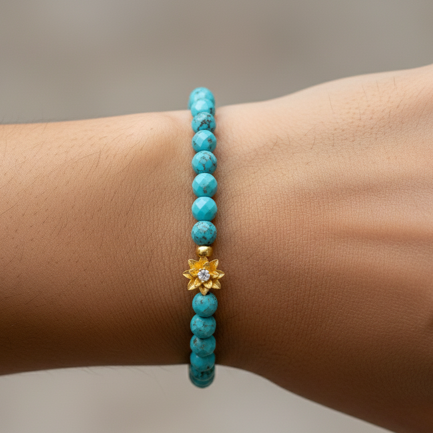 A gemstone bracelet of turquoise—stone of health, intuition, and self-expression—is accented with a golden lotus flower, symbol of new beginnings and full potential. Wear this stretch bracelet alone, or as part of your meaningful bracelet stack.