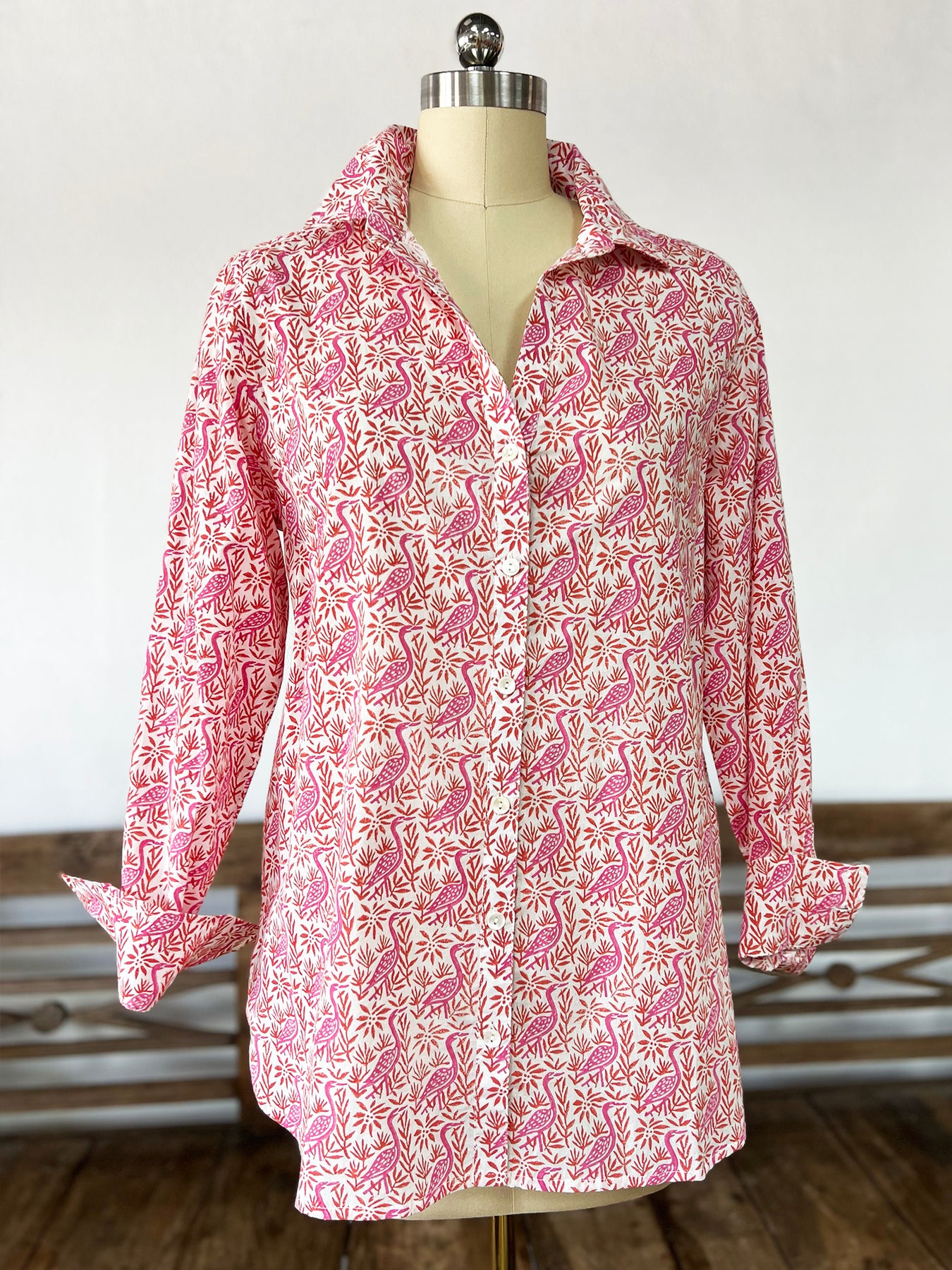 The Artisan Shirt style is a fan favorite-- our take on a traditional men's collared shirt, with an open neck line and easy fit. It can be worn tucked or untucked (shown). This original hand-carved Sand Cranes Print features one of Sigrid's favorite birds, which has been translated into a wood block print by artisans in India.